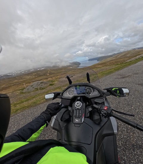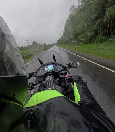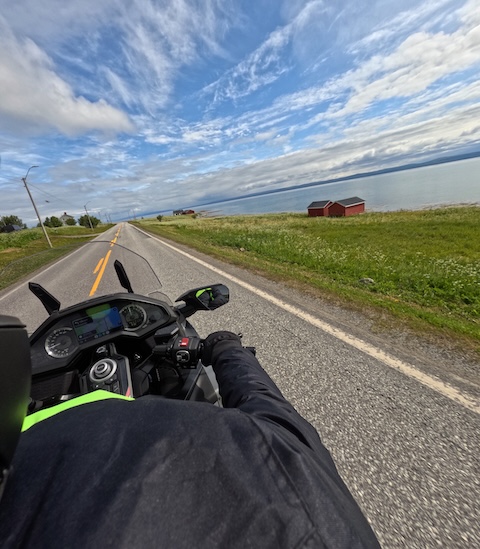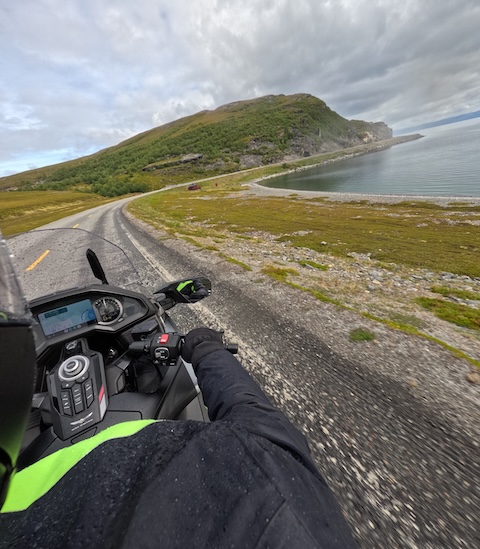 Was im Regen natürlich auch nicht schlecht ist (und nein, entgegen der Gerüchte hat die Goldwing keinen Knopf um das Dach auszufahren!), aber als es gegen Mittag aufhört das ganze etwas ermüdend macht. Es trotten zwar hier und da dann auch mal nen paar Rentiere neben der Fahrbahn (die auch gut daneben bleiben), wirklich spannend ist es nicht. Mal nen Berg nen bisserl hoch, dann runter aber meistens nur gradeaus.